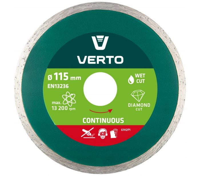 Tarcza diamentowa pełna VERTO (nr ref. 61H2P1) o średnicy zewnętrznej 115 mm, przeznaczona do precyzyjnego cięcia elementów ceramicznych, takich jak terakota, gres, granit, marmur. Marka VERTO oferuje asortyment elektronarzędzi i akcesoriów dla każdego majsterkowicza.