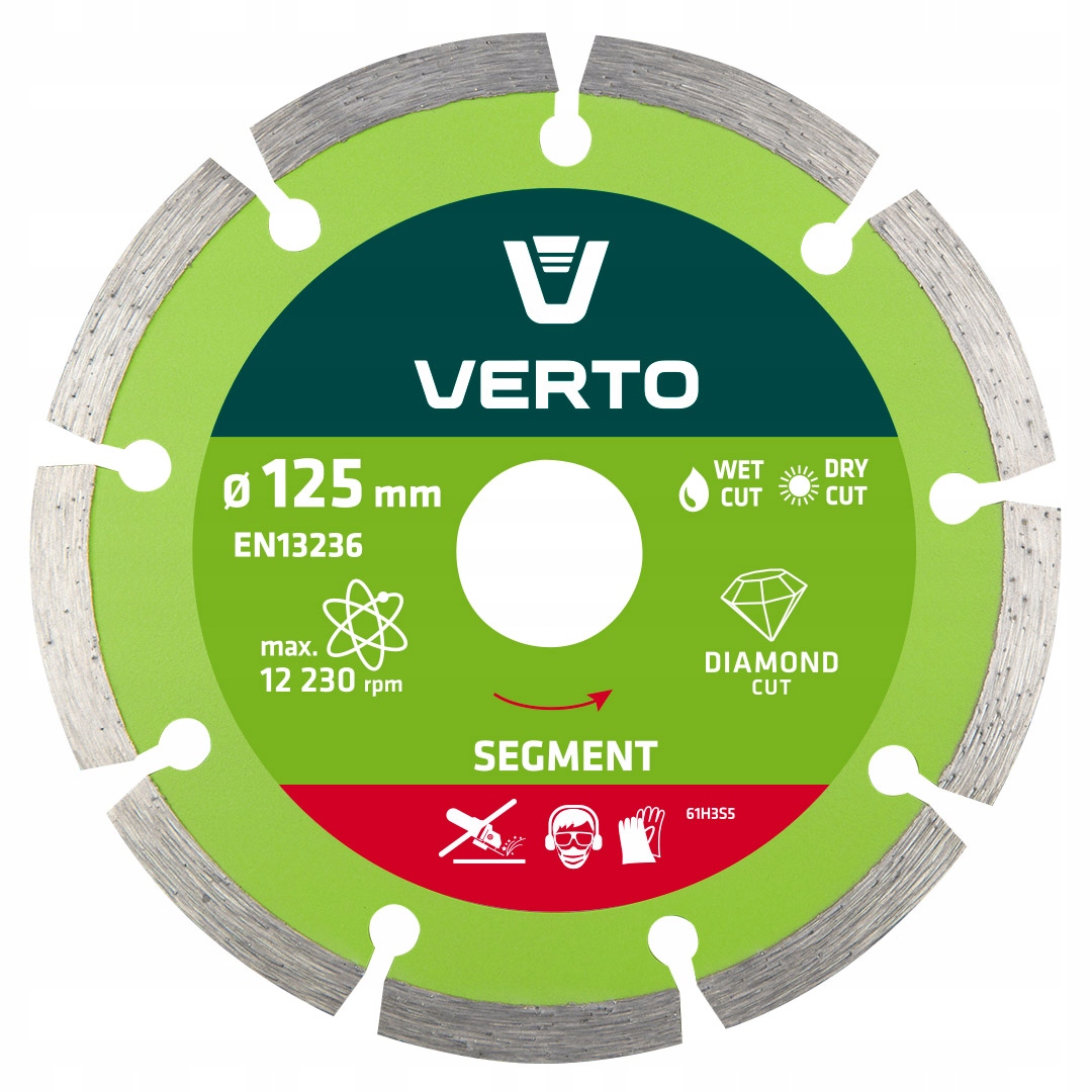 Tarcza diamentowa segmentowa VERTO (nr ref. 61H3S5) o średnicy zewnętrznej 125 mm pozwala wydajnie ciąć elementy wykonane z betonu, betonu zbrojonego, granitu, marmuru, kamienia, cegły itp. Marka VERTO oferuje asortyment elektronarzędzi i akcesoriów dla każdego majsterkowicza.
