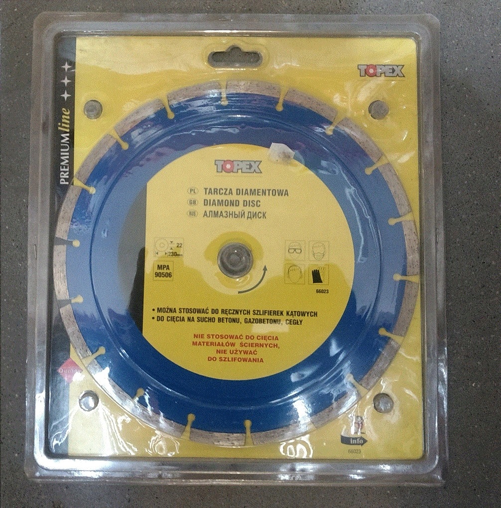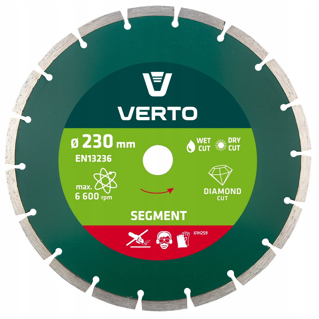 Tarcza diamentowa segmentowa VERTO (nr ref. 61H2S9) o średnicy zewnętrznej 230 mm pozwala wydajnie ciąć elementy wykonane z betonu, betonu zbrojonego, granitu, marmuru, kamienia, cegły itp. Marka VERTO oferuje asortyment elektronarzędzi i akcesoriów dla każdego majsterkowicza.
