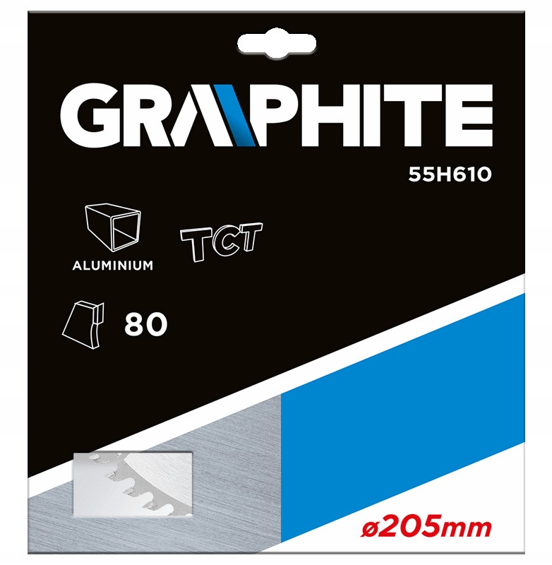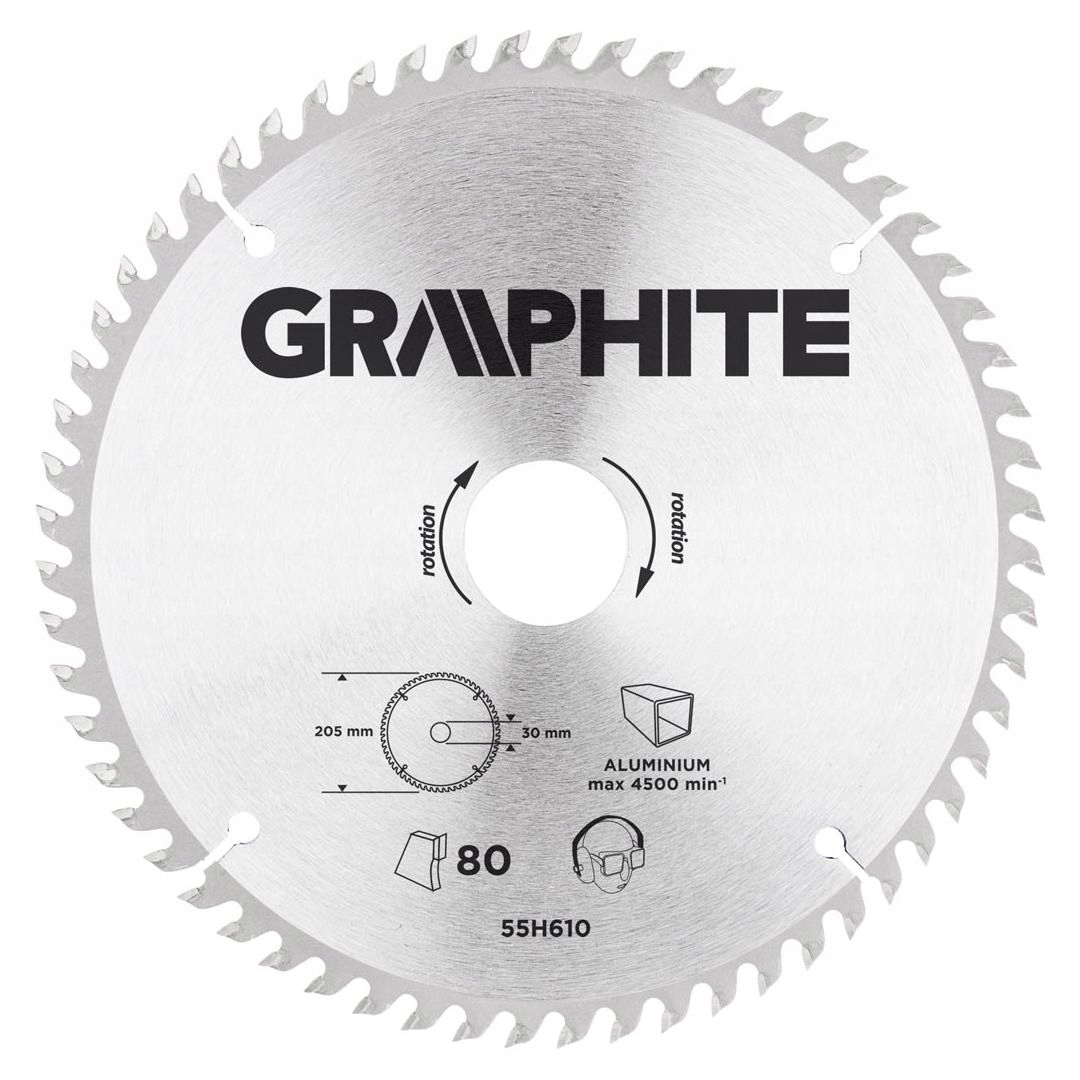 Tarcza do pilarki widiowa GRAPHITE (nr ref. 55H610) o średnicy zewnętrznej 210 mm, wykonana ze stopu stali manganowej MN65 o dużej odporności na temperaturę i odkształcenia. Zęby z nakładkami z węglika spiekanego YG6A pozwalają na zgrubne cięcie materiałów aluminiowych. Zawarte w opakowaniu pierścienie redukcyjne umożliwiają zastosowanie tarczy do większości modeli pilarek.