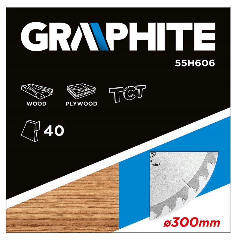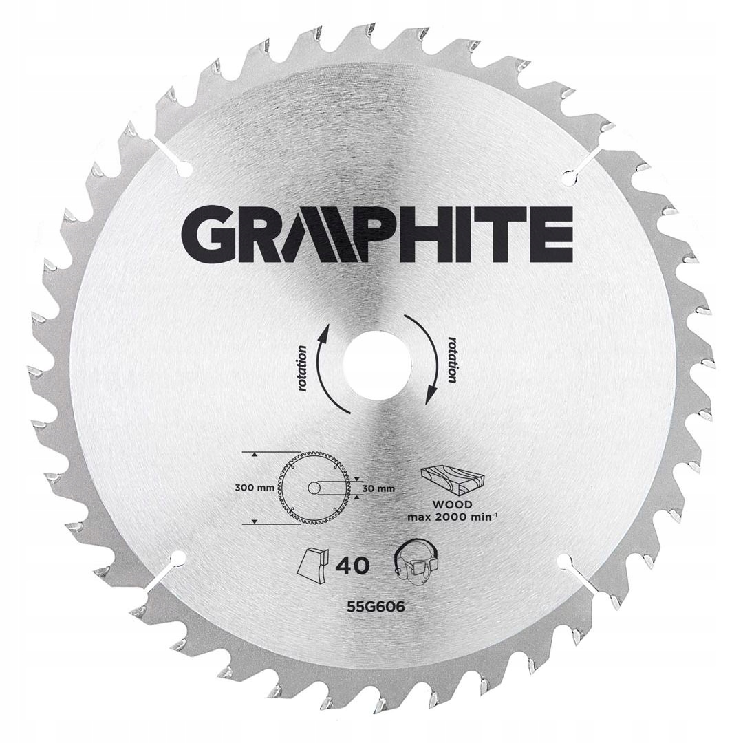 Tarcza do pilarki widiowa GRAPHITE (nr ref. 55H606) o średnicy zewnętrznej 300 mm, wykonana ze stopu stali manganowej MN65 o dużej odporności na temperaturę i odkształcenia. Zęby z nakładkami z węglika spiekanego YG6A pozwalają na zgrubne cięcie drewna i materiałów drewnopochodnych, takich jak sklejka, płyta wiórowa, MDF. Zawarte w opakowaniu pierścienie redukcyjne umożliwiają zastosowanie tarczy do większości modeli pilarek.