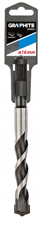 Wiertło do betonu GRAPHITE (nr ref. 57H324) o średnicy 16.0 mm posiada końcówkę widiową o kształcie motylkowym. Pozwala to na wiercenie otworów w betonie i materiałach ceramicznych bez obawy o uślizgiwanie się wiertła na boki w pierwszej fazie wiercenia.
