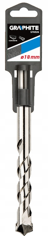 Wiertło do betonu GRAPHITE (nr ref. 57H326) o średnicy 18.0 mm posiada końcówkę widiową o kształcie motylkowym. Pozwala to na wiercenie otworów w betonie i materiałach ceramicznych bez obawy o uślizgiwanie się wiertła na boki w pierwszej fazie wiercenia.