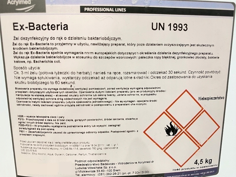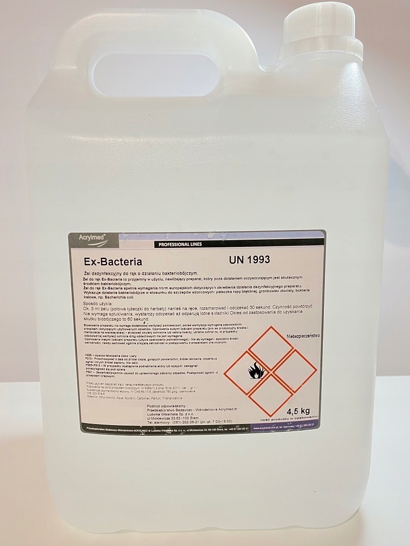 EX-BACTERIA to bakteriobójczy żel do higienicznej dezynfekcji rąk. Przyjemny w użyciu, nawilżający preparat, który szybko oczyszcza i dezynfekuje skórę, nawet w przypadku braku dostępu do bieżącej wody. Żel do rąk spełnia wymagania norm europejskich dotyczących skuteczności preparatów dezynfekcyjnych. Wykazuje działanie bakteriobójcze w stosunku do szczepów wzorcowych : pałeczka ropy błękitnej, gronkowiec złocisty, bakterie kałowe np. Escherichia coli. Skuteczny w walce z ASF, KORONAWIRUSEM, a także przeciw wirusowi HIV, HSV, wzw B i innym wirusom lipofilnym.