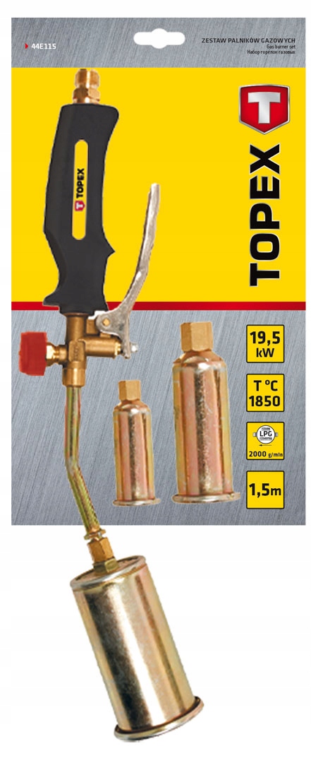 Zestaw palników gazowych TOPEX (nr ref. 44E115) o mocy 19.5kW, temperaturze płomienia 1850°C. Zestaw zawiera 3 palniki uniwersalne. Z wężem o długości 1.5 m. Doskonale sprawdza się w pracach warsztatowych. Marka TOPEX skierowana jest do majsterkowiczów.