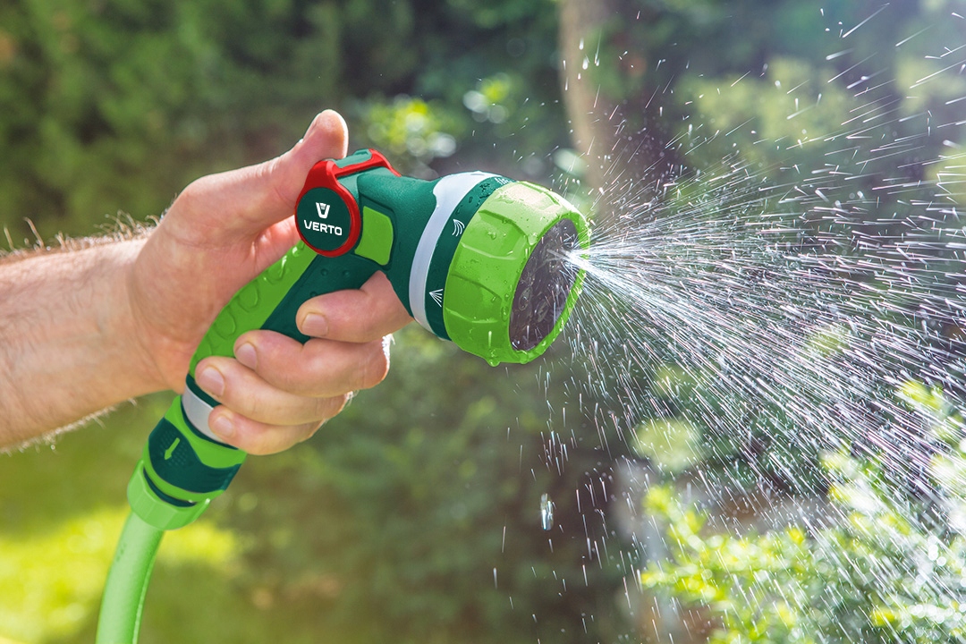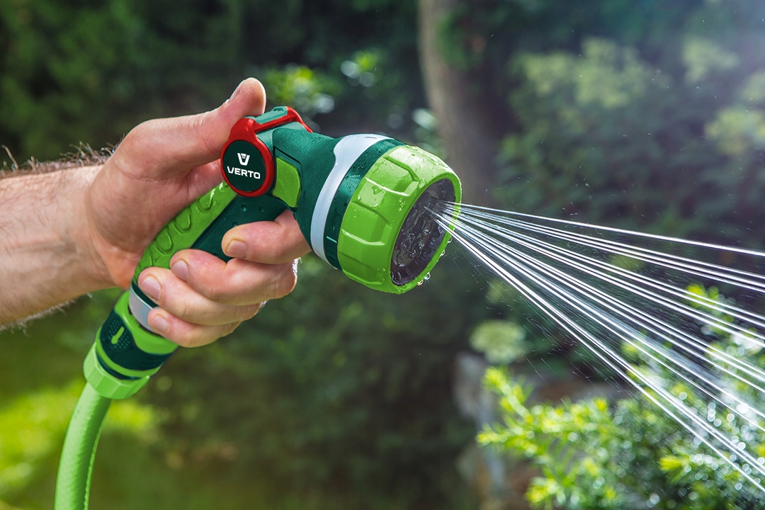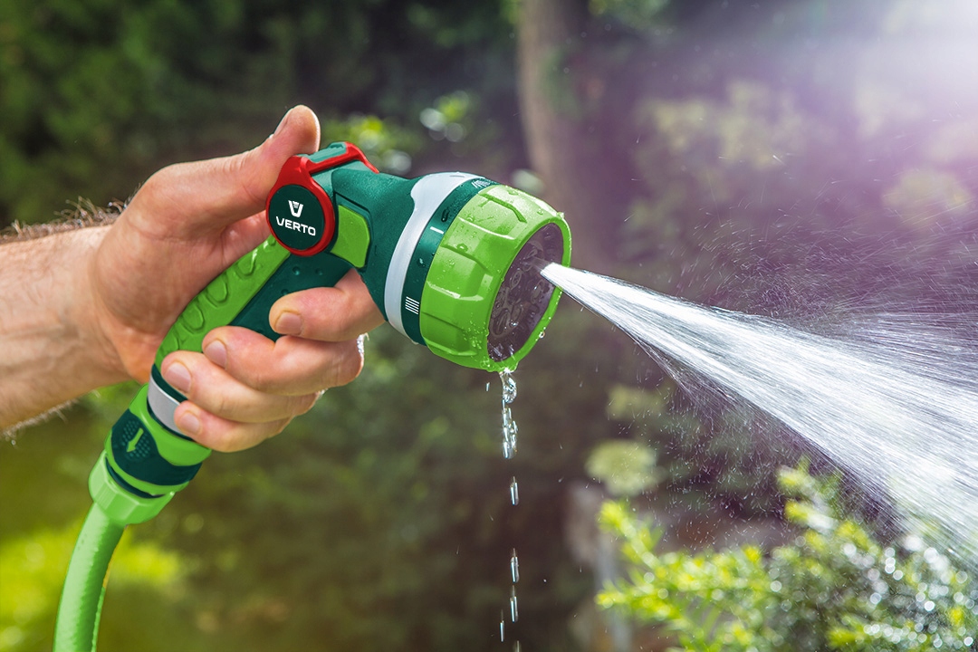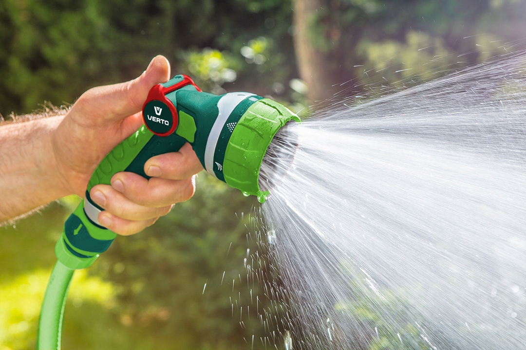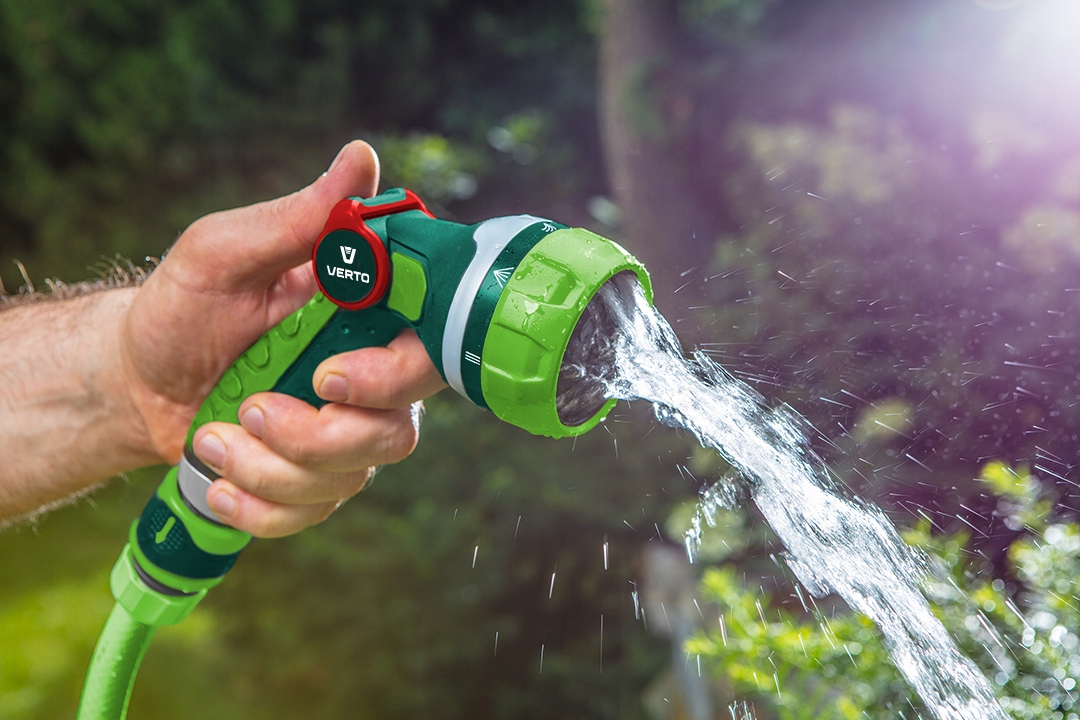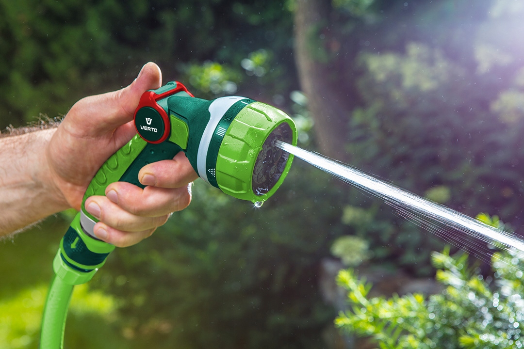 Zraszacz pistoletowy 7-funkcyjny VERTO (nr ref. 15G710) z płynna regulacją strumienia za pomocą kciuka. Pistolet został wyposażony w funkcje regulacji strumienia wody, która pozwoli dopasować jego moc do wykonywanej czynności. Czytelne oznaczenia ułatwiają wybór odpowiedniego rodzaju strumienia. Uchwyt o ergonomicznym kształcie dobrze leży w dłoni i nie wyślizguje się, co podnosi komfort pracy.